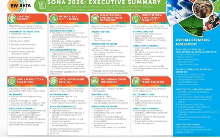 An executive overview of how SONA 2026 reshapes priorities for infrastructure, water security, energy reform and youth employment and
