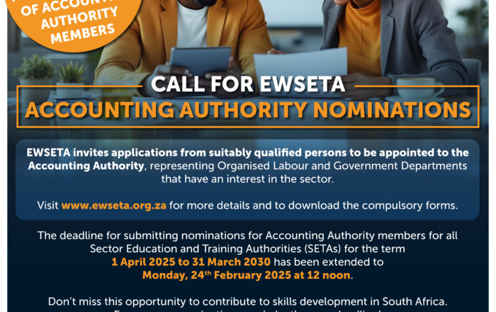 Apply now!! Deadline extended to Monday, 24th February 2025 at 12 noon. Submit your application to aanominations@ewseta.org.za